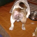 Update 7/19/11: Beefy is progressing well. Stitches are out and no sign of returning infection. We will wait several more weeks to ensure he is out of the woods from an infection standpoint before we proceed to knee surgeries.Update 8/1/11: Beefy continues to heal well. We have decided to wait until it’s cooler before we proceed with his knee surgeries. He gets around well now, we don’t want to stress him more with temperatures exceeding 90 degrees. Of course if things deteriorate, we’ll initiate treatment. I have had him since his” Beefy behind “surgery because of the unusual nature of the problem and the surgery, but will be looking for a low key home without stairs to foster him through the knee surgeries. He’s a very sweet boy but rather large and Beefy.