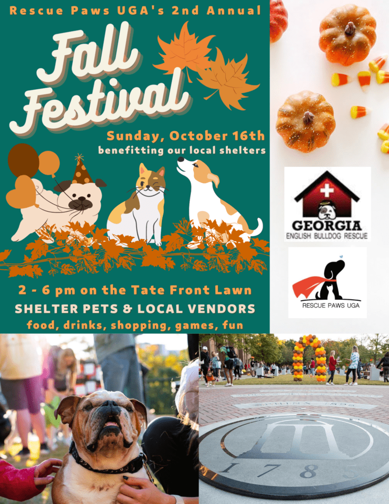Join us on the Tate Front Lawn at UGA for Rescue Paws UGA’s Fall Festival.Food, drinks, shopping, games and fun!All dogs welcome!