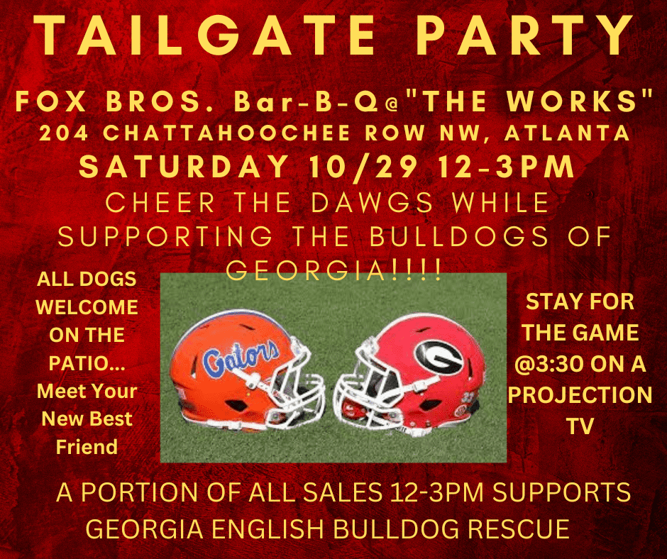 Join us for a UGA vs. Florida Tailgate Party at Fox Bros. Bar-B-Q at The Works 15% of all food and beverage sales between 12pm – 3pm will be donated to the bullies All dogs welcome on the patio