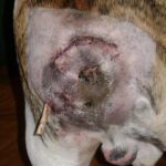 Update 7/19/11: Beefy is progressing well. Stitches are out and no sign of returning infection. We will wait several more weeks to ensure he is out of the woods from an infection standpoint before we proceed to knee surgeries.Update 8/1/11: Beefy continues to heal well. We have decided to wait until it’s cooler before we proceed with his knee surgeries. He gets around well now, we don’t want to stress him more with temperatures exceeding 90 degrees. Of course if things deteriorate, we’ll initiate treatment. I have had him since his” Beefy behind “surgery because of the unusual nature of the problem and the surgery, but will be looking for a low key home without stairs to foster him through the knee surgeries. He’s a very sweet boy but rather large and Beefy.