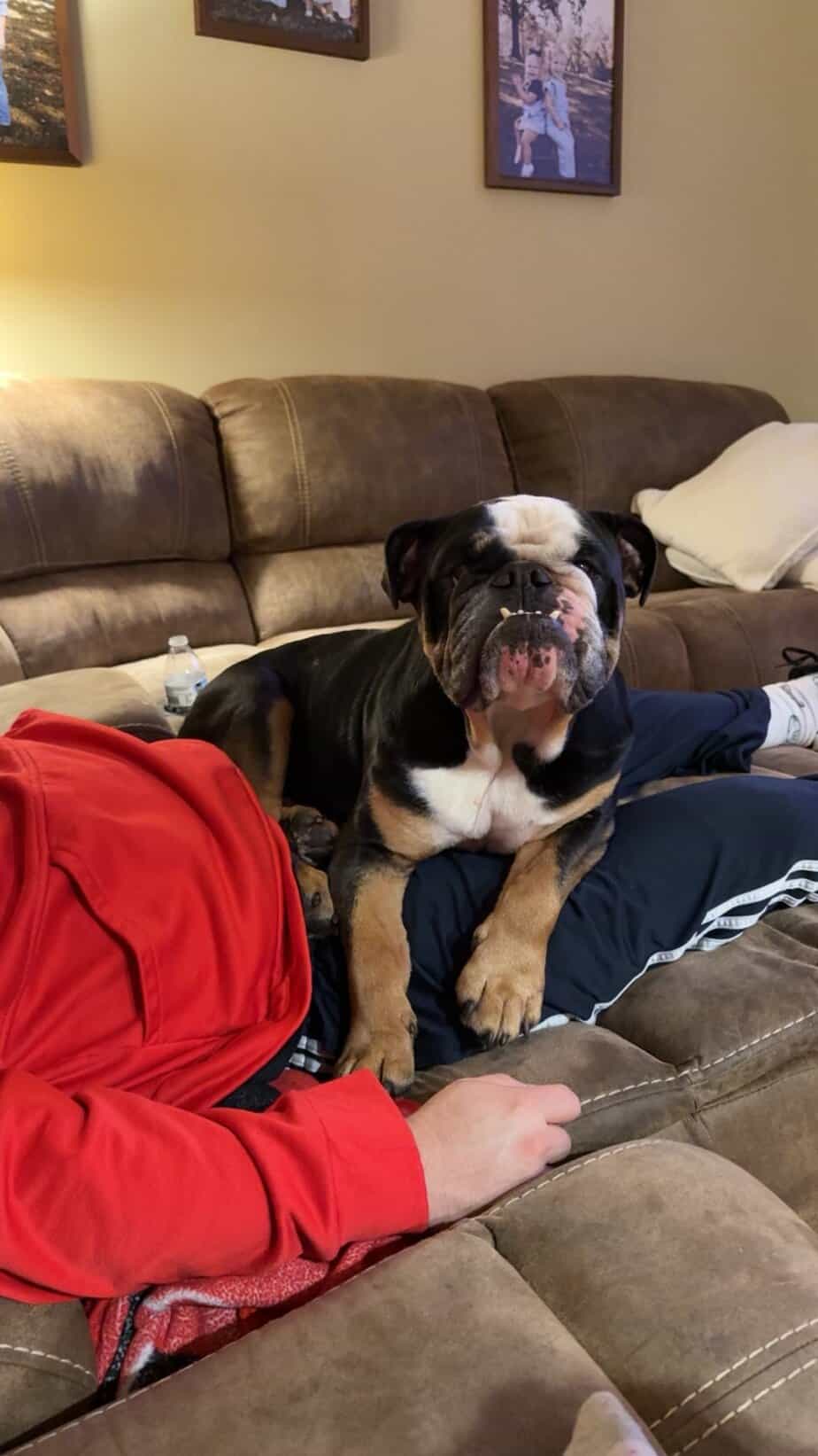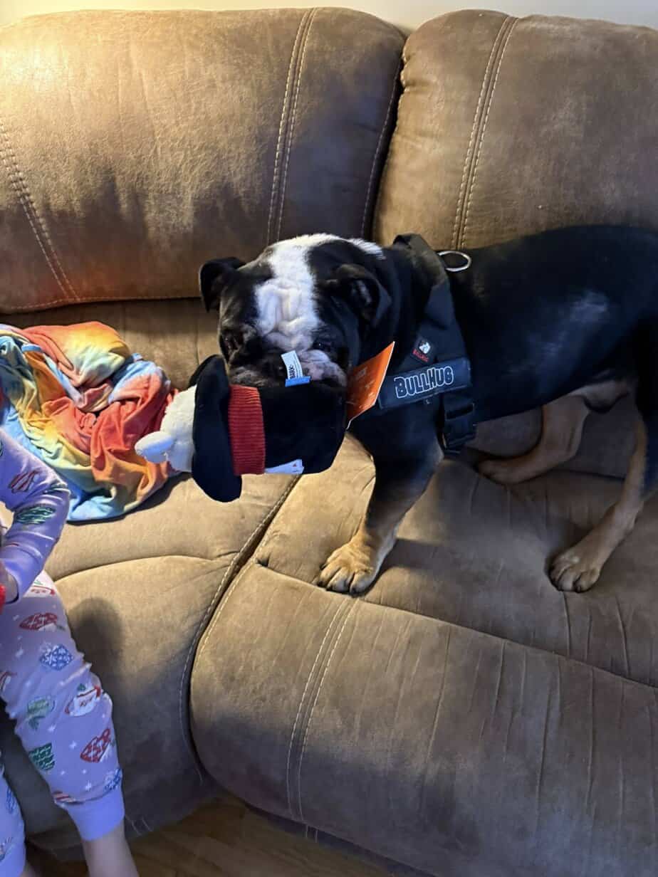 Dislikes? He doesn’t like his eyedrops, but is starting to handle it better. He doesn’t seem to mind having his face folds wiped out but anything else on his face he’s a little cautious. He doesn’t like for people to take toys or bones from him, but he doesn’t seem to mind when you’re around his food or water bowls.
