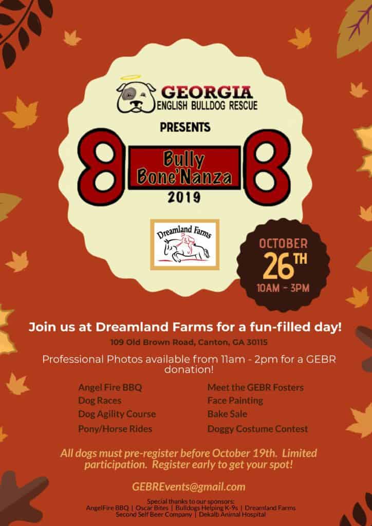 The Bully Bone’Nanza is a fall festival being held on Oct 26, 2019 to benefit Georgia English Bulldog Rescue of Atlanta, GA, – a 501(c)(3) non-profit organization in their quest to rescue abused, abandoned, sick and unwanted English Bulldogs.