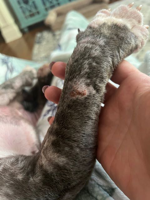 9/23/24 – Please welcome Moonpie! Moonpie was picked up as a stray and turned over to us by the shelter. She has a pretty bad skin infection and mange, but once that clears up we will move forward with surgery.