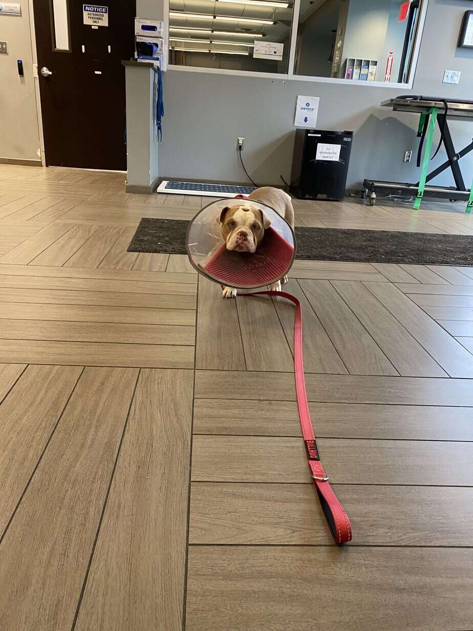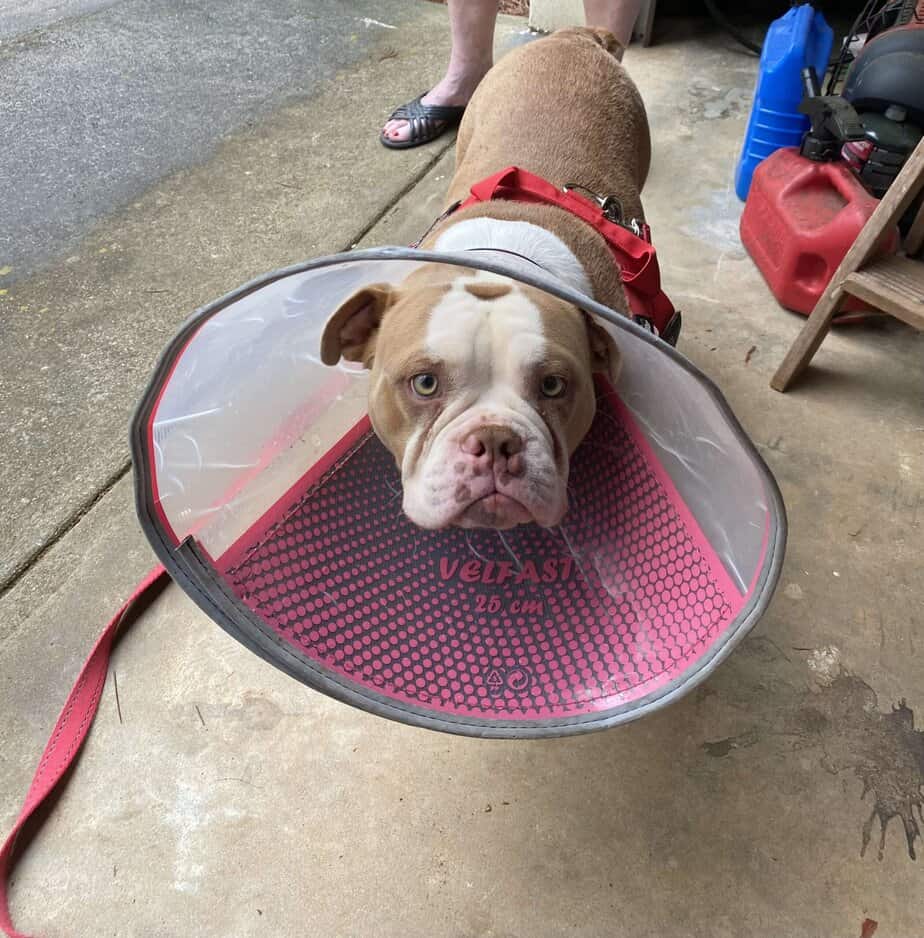 4/6/25 – Papaya had surgery today and all went well. She was spayed, had he palate shortened and had her saccules removed. She is still swollen so there is a significant amount of tissue outside of her body, we expect this to shrink back to normal size over the next few weeks now that she is spayed and finished her heat cycle.