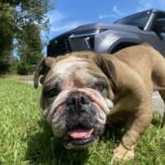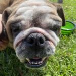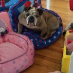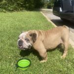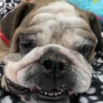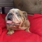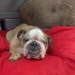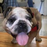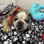 9/11/25 – Rylie had surgery today and all went well! She was spayed, had her palate shortened, her nares widened, her teeth cleaned and entropion on one lower eye lid. She appears to be “bull-legged” on her front legs but was either born that way or had some trauma at some point in her life. She seems to manage ok getting around the house and yard, but we have not seen her on steps so we do not know how she would manage those. Her eye are little cloudy from the years of untreated dry eye.