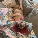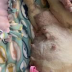 2/22/24 – Please welcome Sugar Bear! Sugar Bear was picked up as a stray and turned over to us by the shelter. This poor girl still has staples from a previous c-section, but no milk so it must have been a little while since she has puppies.