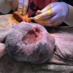 9/1/20: Willow had chest x-rays done this morning and they looked okay, but her bloodwork indicates she is not healthy enough to have the mass removed quite yet. Willow is anemic, likely from previous flea issues. Her albumin levels are also low, which is likely a result of poor nutrition. We are putting her on some good food and will be feeding her eggs, which are good for albumin levels. Raising these levels is particularly important as this will help her through healing and recovery. The mass is ulcerated but it is not actively bleeding. There is a small amount of discharge, so we are keeping it wrapped. Once the mass is removed, we will have it biopsied. Willow is now on pain medication and antibiotics. We will recheck bloodwork next week and go from there.